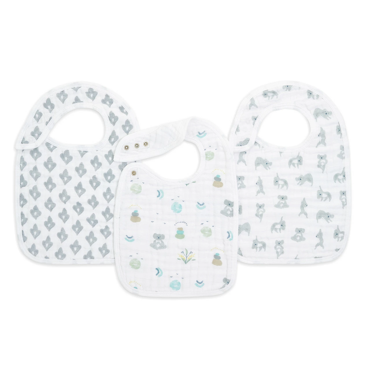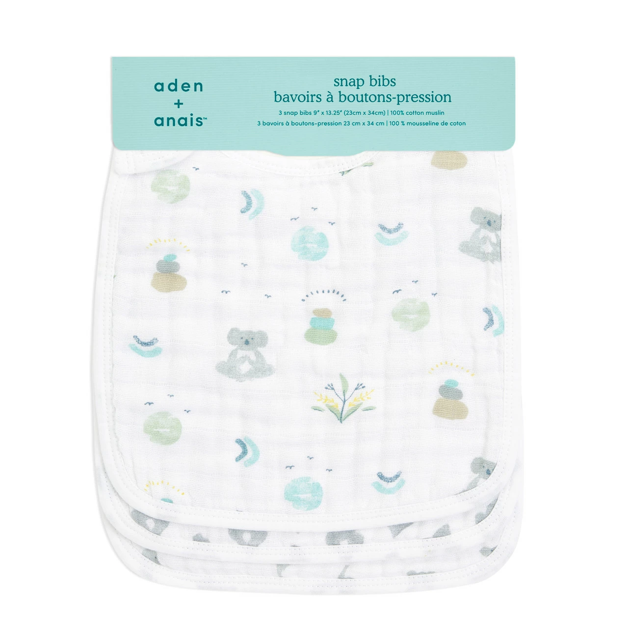 Includes 3 pre-washed 9” x 12” (23cm x 30.5cm) 100% cotton muslin snap bibs.