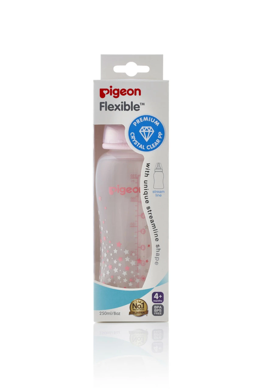 Pigeon Flexible Crystal PP Bottle is a slim neck bottle with an attractive pink star design. Use with Pigeon Flexible Peristaltic Teats. Made from clear, light weight plastic (Crystal PP; polypropylene), the Flexible Crystal PP bottle has a streamline shape and is suitable for regular to high use. The bottle is supplied with a Flexible Peristaltic teat. Each teat has a slim neck with double thickness silicone to ensure ideal softness and flexibility for latching on comfortably and easily. Each teat also features a unique venting system to minimise swallowed air and help reduce colic. BPA and BPS free. Bottle capacity: 250 ml. Teat size M, round hole, 4+ months.