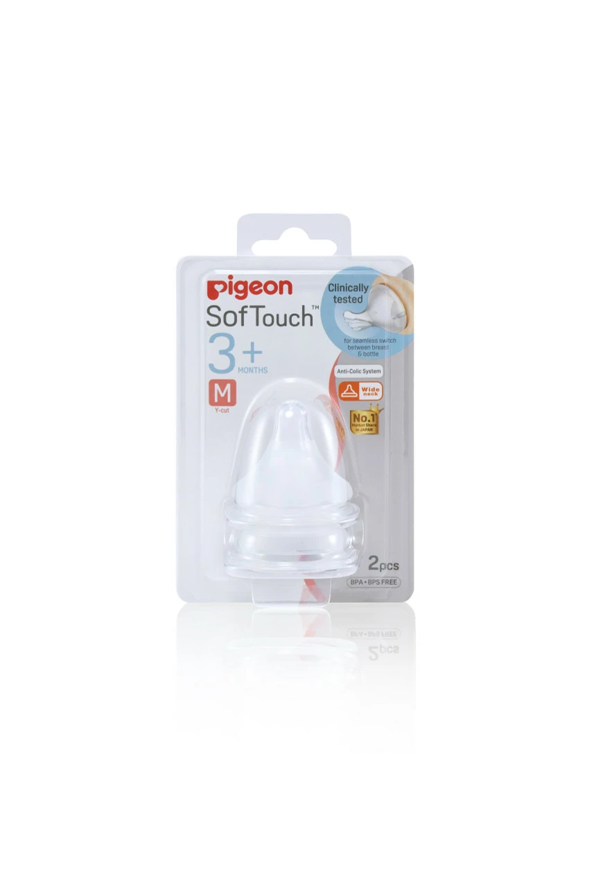 Pigeon SofTouch Peristaltic PLUS teat is highly acclaimed – the result of extensive research into latching, peristaltic movement and swallowing. It has a wide neck design similar to breast shape to avoid nipple confusion and features a textured surface for perfect latch on and good tongue position. Firm, but soft, the teat allows babies to use their natural feeding motion and each has an Air Ventilation System (AVS) to support constant milk flow and help reduce colic. BPA and BPS free. Teat size M. Y cut hole. 3+ months.