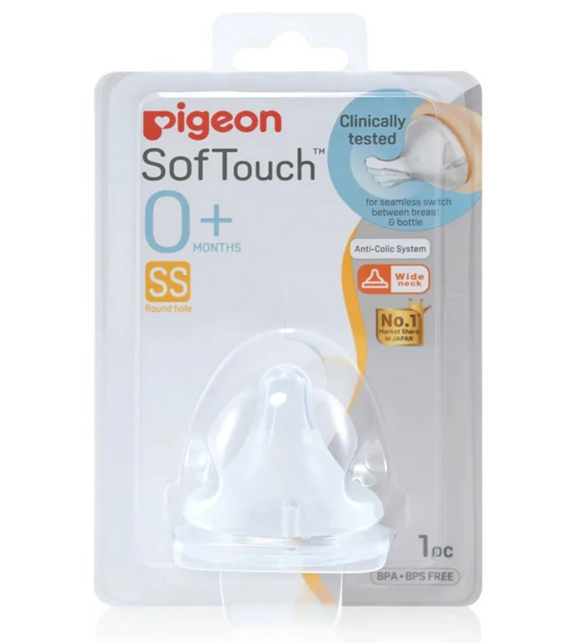 As a guide use this teat for babies 0-1 months old. Pigeon SofTouch Peristaltic PLUS teat is highly acclaimed – the result of extensive research into latching, peristaltic movement and swallowing. It has a wide neck design similar to breast shape to avoid nipple confusion and features a textured surface for perfect latch on and good tongue position. Firm, but soft, the Peristaltic PLUS teat allows babies to use their natural feeding motion and each has an Air Ventilation System (AVS) to support constant milk flow and help reduce colic. BPA and BPS free. Peristaltic PLUS teat size SS – round hole.