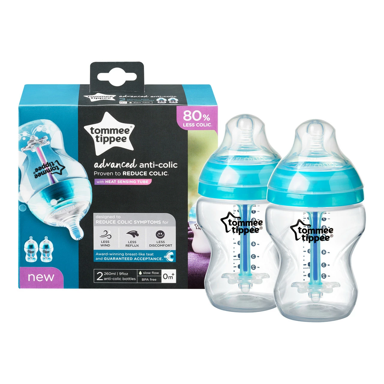 With our award-winning** Advanced Anti-Colic baby bottle, switching between breast and bottle feeding has never been simpler. With our breast-like teat and unique anti-colic technology, it could just be the best thing for baby, since you! Inspired by mum, designed by experts. This is no ordinary bottle. Tommee Tippee Advanced Anti-Colic bottles work a little differently from regular bottles to help combat colic while ensuring a comfortable feeding experience for you and your baby. The unique 3-piece anti-colic venting system draws air away from milk and the star valve keeps milk from traveling up the tube, meaning less wind, reflux and discomfort – 84% of mums who used our anti-colic bottles agreed they reduced their baby’s colic symptoms.* Plus, the anti-colic venting tube comes with a built-in heat sensing strip that gives you extra reassurance that the milk is a safe temperature for baby. Loved by mums and babies, our easy latch-on, breast-like teat feels closer to skin and mimics the natural flex and movement of a mum’s breast for a comfortable feeding. 95% of mums reported that their baby accepted the super soft silicone teat with skin-like feel and would recommend to others.* Easy to clean and suitable for use in the dishwasher, microwave and steam sterilisers. 100% BPA-free for complete peace of mind. Which flow rate do I need? We offer different flow rates to keep up with your growing baby. Every baby is different but as a guide we suggest slow flow for 0+ months, medium flow for 3+ months and fast flow for 6+ months. Advanced Anti-Colic teats are only compatible with Advanced Anti-Colic bottles. How often should I replace the bottle teats? We recommend changing your bottle teats every two months. And you should change them immediately if they’re damaged or weak. * Based on 2021 study of 524 parents who use Tommee Tippee bottles. ** Made for Mums March 2020Naturally anti-colic*: 84% of mums who tested agreed the Tommee Tippee Anti Colic bottle had successfully reduced their baby’s colic symptoms Breast-like: Our soft silicone, breast-like teat feels closer to skin and flexes like mum for a natural latch and a comfortable feed – voted mum’s #1 bottle for switching between breast and bottle* Less air, more smiles: Tommee Tippee anti colic baby bottles have an Anti-colic tube that draws air away from milk to reduce colic symptoms for less wind, less reflux and less discomfort Heat sensing technology: The venting tube features an in-built heat sensing strip that turns pink when baby’s milk is too hot Mum recommended: 95% of mums would recommend Tommee Tippee Closer to Nature bottles to others*