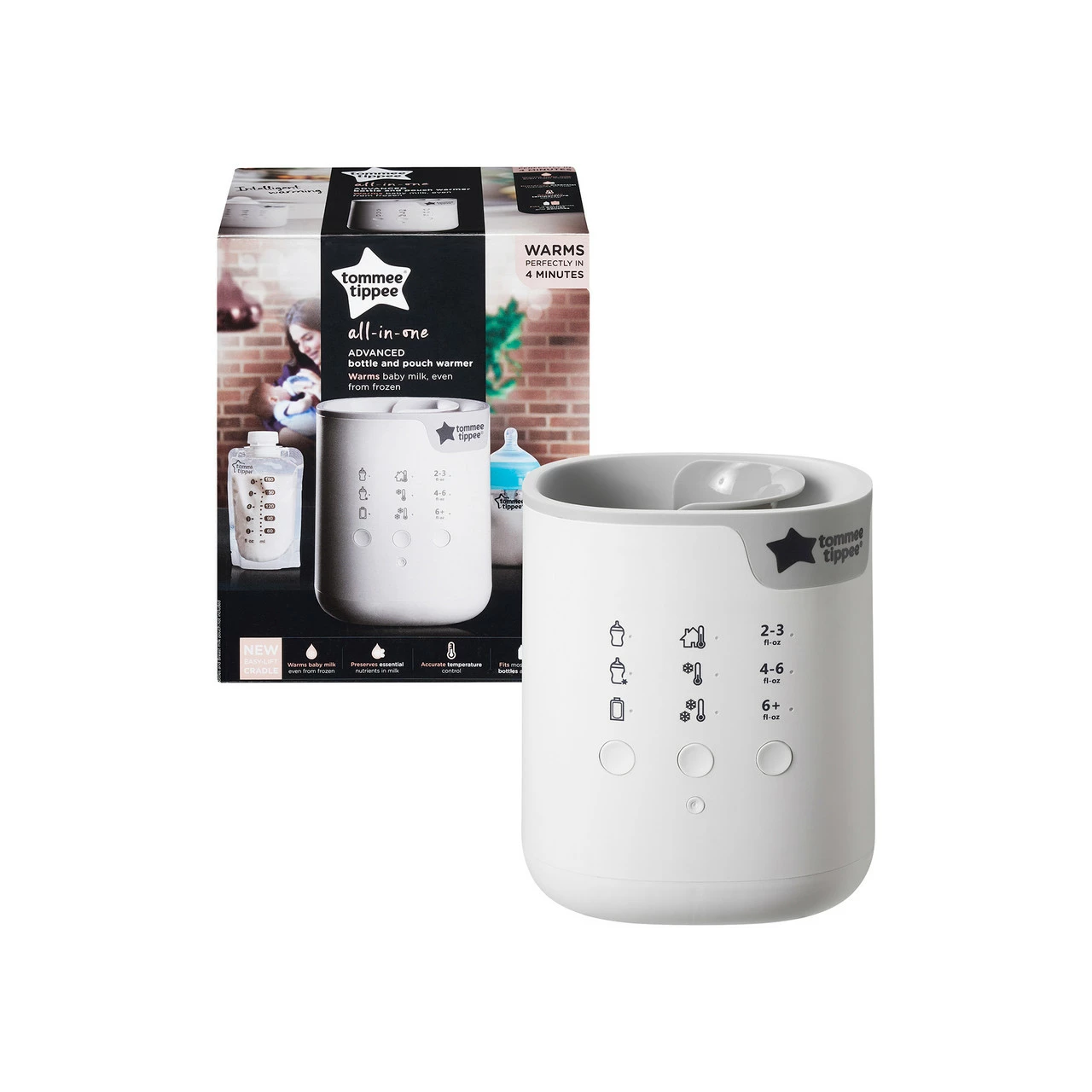 Warming baby’s feeds to body temperature helps create a more natural experience for babies. It’s gentler on your baby’s tummy too. With the Tommee Tippee Bottle and Pouch Warmer you can quickly and gently warm breast milk and formula to the perfect temperature every time. Simply select plastic, or glass container, feed volume and starting temperature and the warmer automatically works out the optimum warming time. Helping you Parent On * Warming times depend upon capacity and starting temperature of feed. Warming time of 4 minutes is based on heating a 150ml serving of milk from ambient room temperature (20°C).